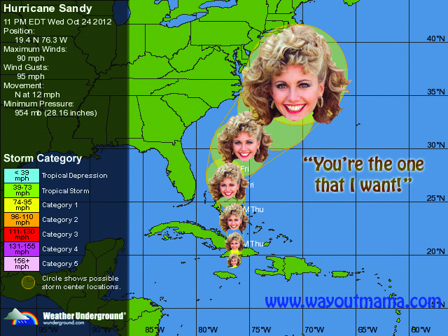 Hurricane Sandy C’mon, Sandy! You’re the one that I want! Perfect Storm! I know, I know. Total long-shot, but hey. Arctic air coming in, hurricane coming… Snowicane! Hurricane Sandy Share this: Click to share on X (Opens in new window) X Click to share on Facebook (Opens in new window) Facebook Click to share on Pinterest (Opens in new window) Pinterest Click to share on Reddit (Opens in new window) Reddit Click to share on LinkedIn (Opens in new window) LinkedIn Click to share on Tumblr (Opens in new window) Tumblr Click to print (Opens in new window) Print Click to email a link to a friend (Opens in new window) Email Like Loading...